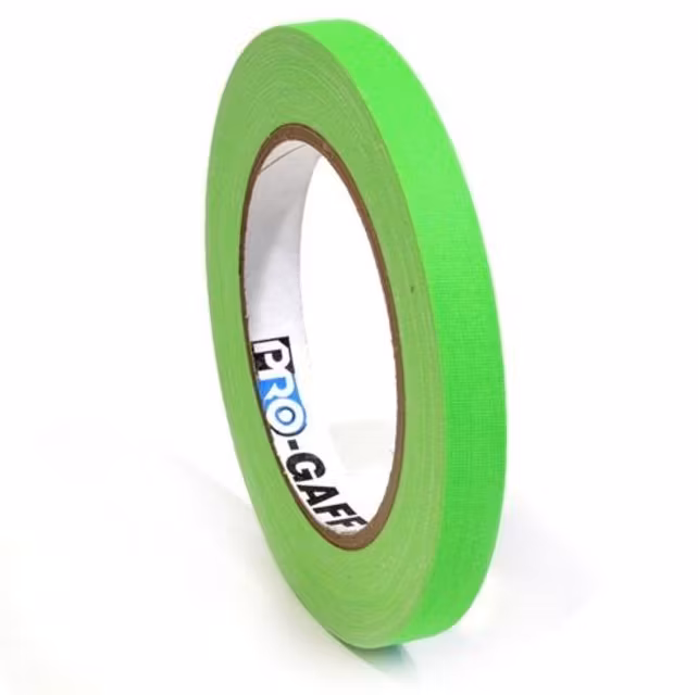 Pro Gaff is a matte cloth tape with a synthetic rubber adhesive system (SRA). Available in 21 colors, making it easy to match any carpet, flooring, or equipment. Featuring 5 high visibility, UV-reactive fluorescent colors, as well as Chroma Green for color keying. Easy to tear by hand and writeable with pens and markers. Pro Gaff contains ZERO polyvinyl chloride (PVC), making it a great alternative to similar PVC coated cloths or vinyl film tapes. Ideal for wire and cable hold down and bundling. Temporary holding of light fixtures and sound equipment. Marking and labeling equipment cases. Labeling audio boards and sound equipment. Marking stages and rigging. Safety marking on stairs, exits, and sets. Labeling in low light environments such as audio booths. Dance floor splicing. Chroma Green color supports color keying. Built for demanding film, TV and broadcast workflows—ideal for camera, lighting and sound departments on set and in studio.