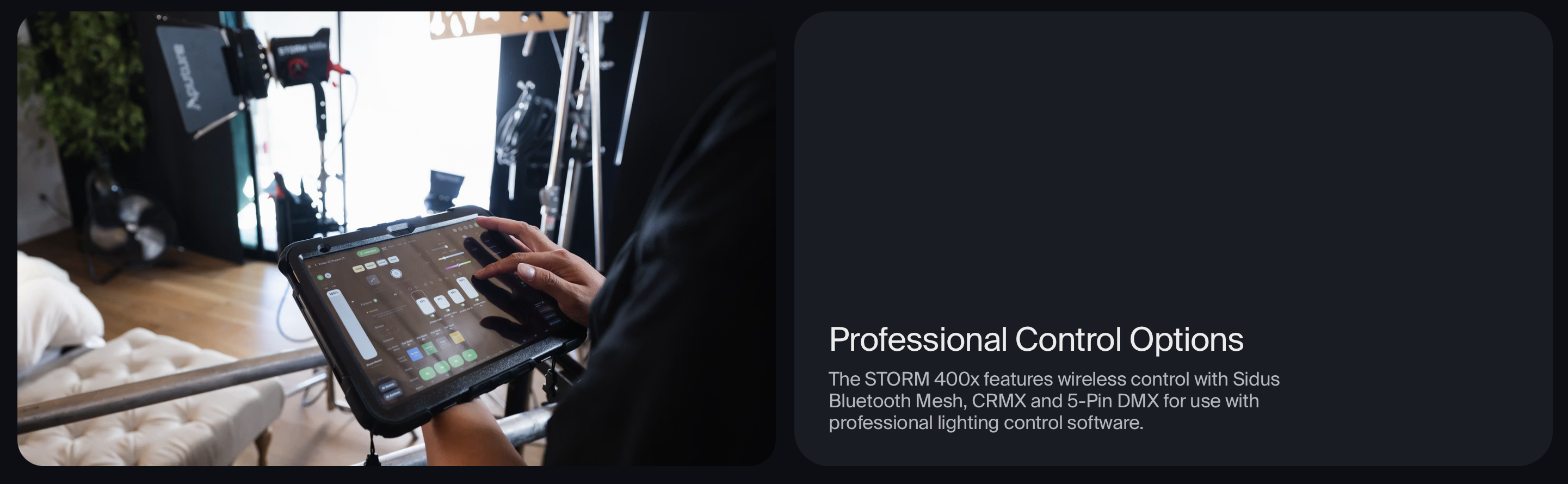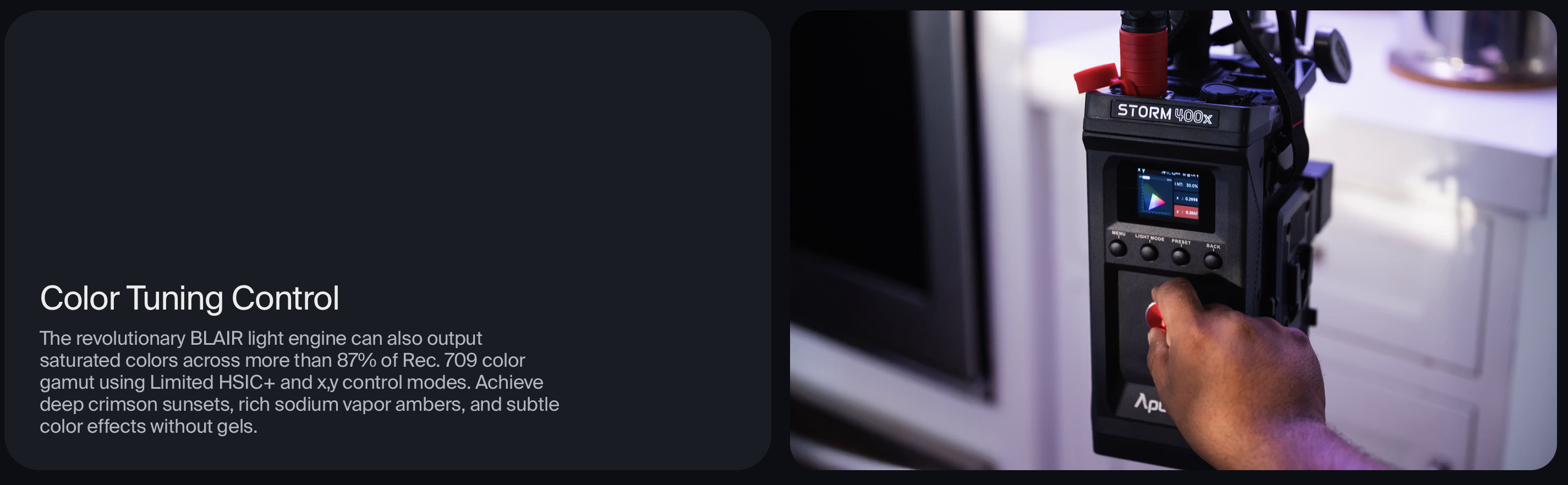 Aputure STORM 400x är utrustad med den avancerade BLAIR-ljusmotorn (Blue/Lime/Amber/Indigo/Red), som levererar oöverträffad vitljuskvalitet och branschledande justering av +/- grön. Tack vare indigo-emitterna återskapas fluorescerande material på ett sätt som påminner om naturligt dagsljus och klassiska tungsten-källor.