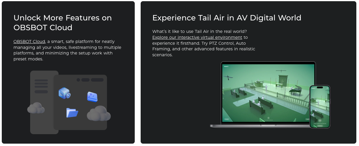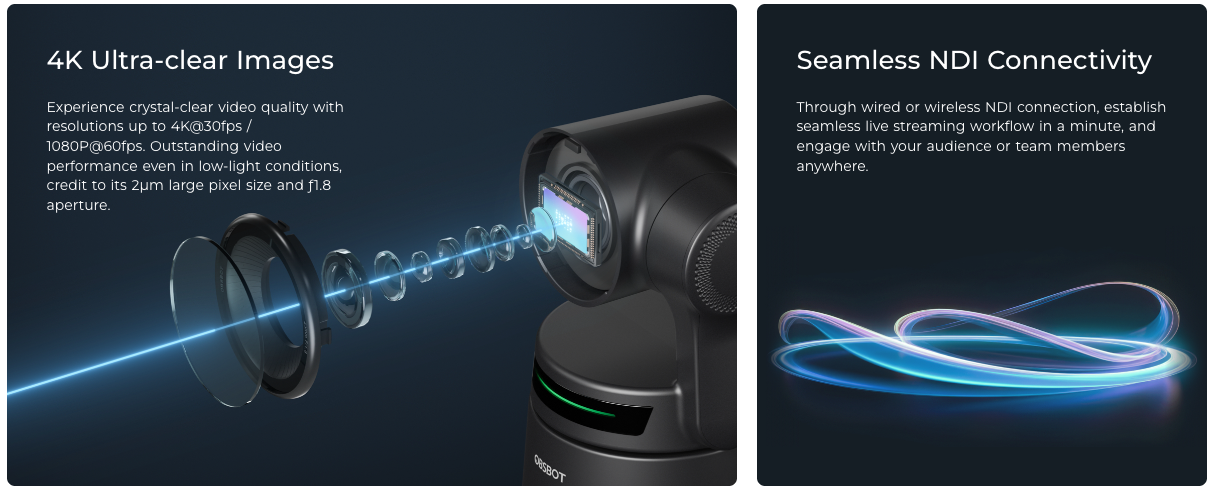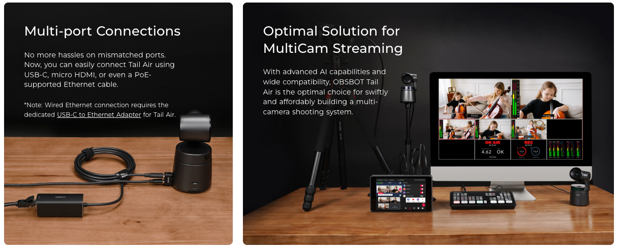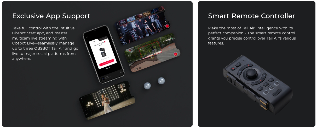 OBSBOT Tail Air 544,08 € I lager Lägg i korgen Número de artículo: OSB-2108-CW Parte Information Advanced AI Auto TrackingUHD Resolutions up to 4K@30fps / 1080P@60fpsSeamless NDI ConnectivityMulti-port ConnectionsExclusive App Support: Obsbot Start & Obsbot Live