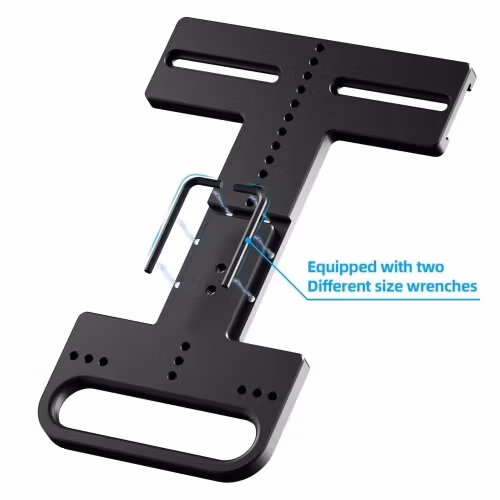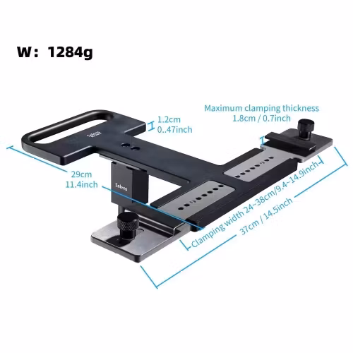 It features adjustable clamp plates from 9.44" to 15" wide to fit laptops of various sizes. The bottom of the plate includes multiple 1/4" threaded holes for mounting accessories, like SSD holder.