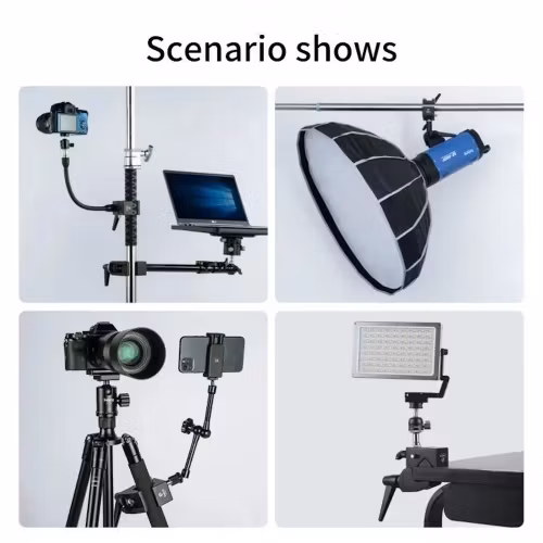 The Selens Super Clamp is a versatile aluminum alloy clamp designed to hold a wide variety of items, such as light stands, cameras, hooks, rods, and more. It also allows for the attachment of additional accessories directly onto the clamp.