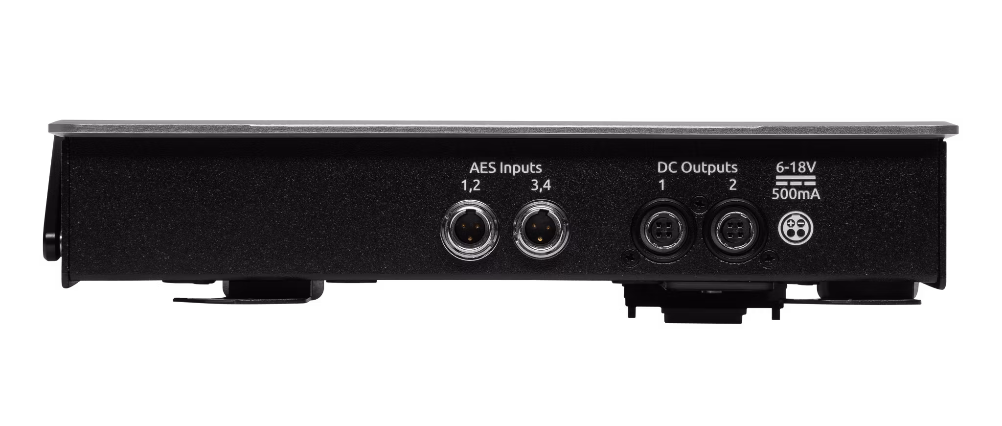 An 8-Series mixer-recorder supplies power to the SL-2 and slotted-in receivers – no external DC connector needed. Analog or digital audio is sent from the receivers into the mixer-recorder via the expansion port, reducing messy cabling for power and audio connectivity. The SL-2 offers antenna distribution to slot-in receivers, spreading out the placement of antennas for better RF performance. The rear panel of the SL-2 is equipped with two TA3 connectors for an additional four inputs of AES3 audio and two 4-pin Hirose DC Outputs, each supplying up to 500 mA for powering additional equipment.