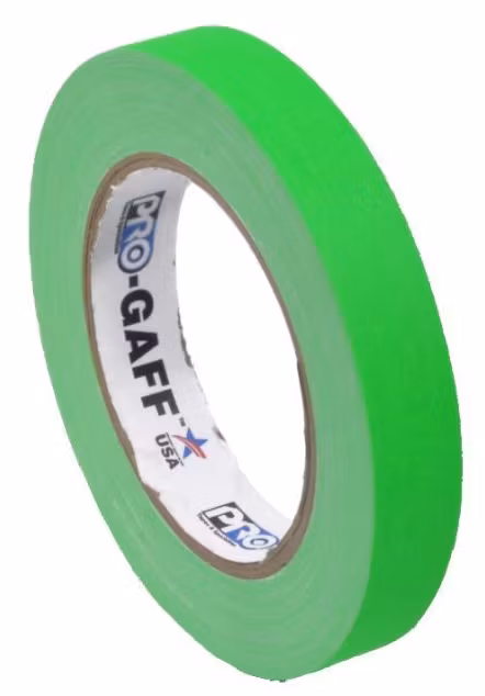 Pro Gaff is a matte cloth tape with a synthetic rubber adhesive system (SRA). Available in 21 colors, making it easy to match any carpet, flooring, or equipment. Featuring 5 high visibility, UV-reactive fluorescent colors, as well as Chroma Green for color keying. Easy to tear by hand and writeable with pens and markers. Pro Gaff contains ZERO polyvinyl chloride (PVC), making it a great alternative to similar PVC coated cloths or vinyl film tapes. Ideal for wire and cable hold down and bundling. Temporary holding of light fixtures and sound equipment. Marking and labeling equipment cases. Labeling audio boards and sound equipment. Marking stages and rigging. Safety marking on stairs, exits, and sets. Labeling in low light environments such as audio booths. Dance floor splicing. Chroma Green color supports color keying. Built for demanding film, TV and broadcast workflows—ideal for camera, lighting and sound departments on set and in studio.